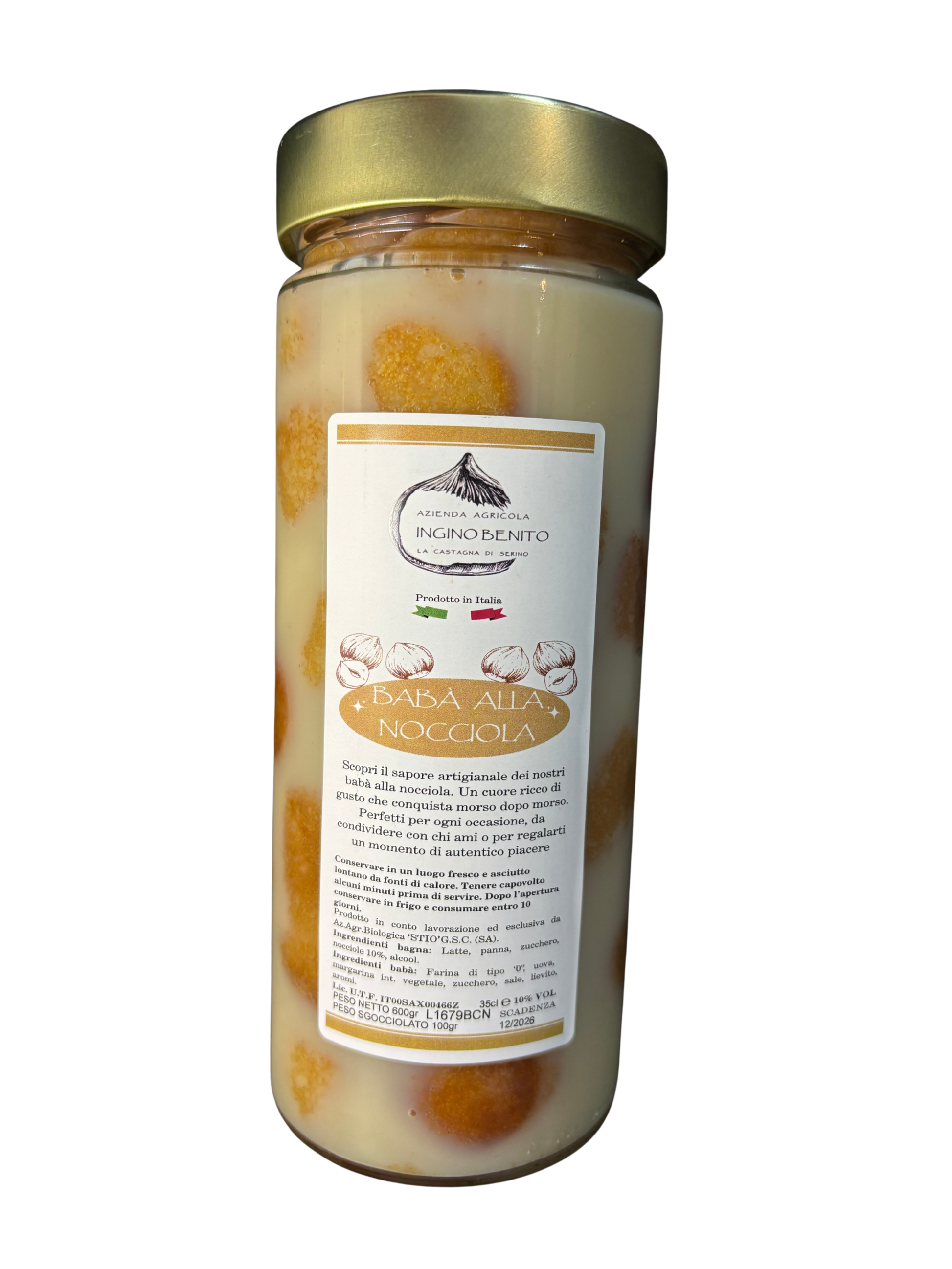 Ingredienti babà: Farina di tipo ‘’0'’, uova, margarina int. vegetale, zucchero, sale, lievito, aromi.